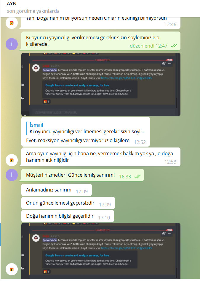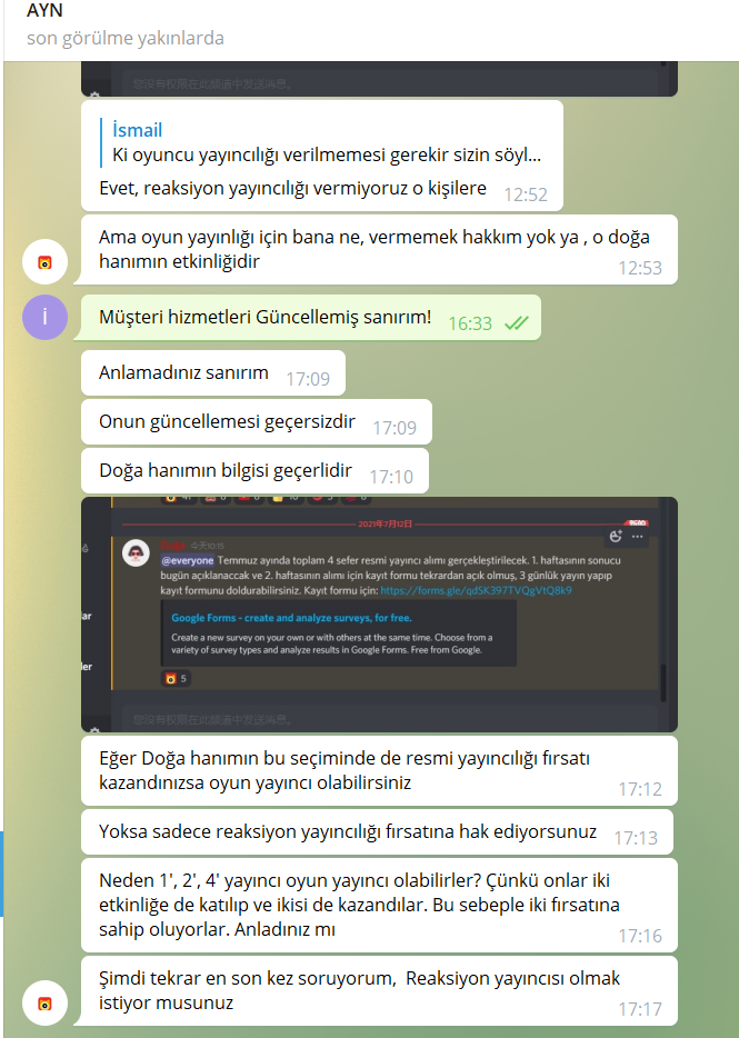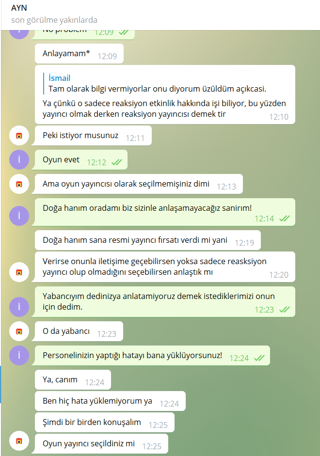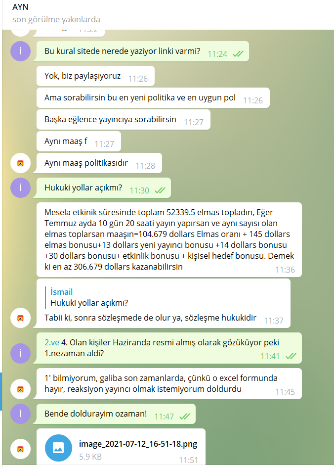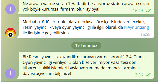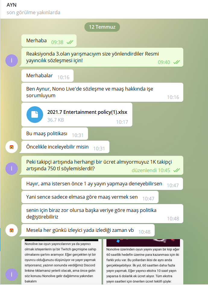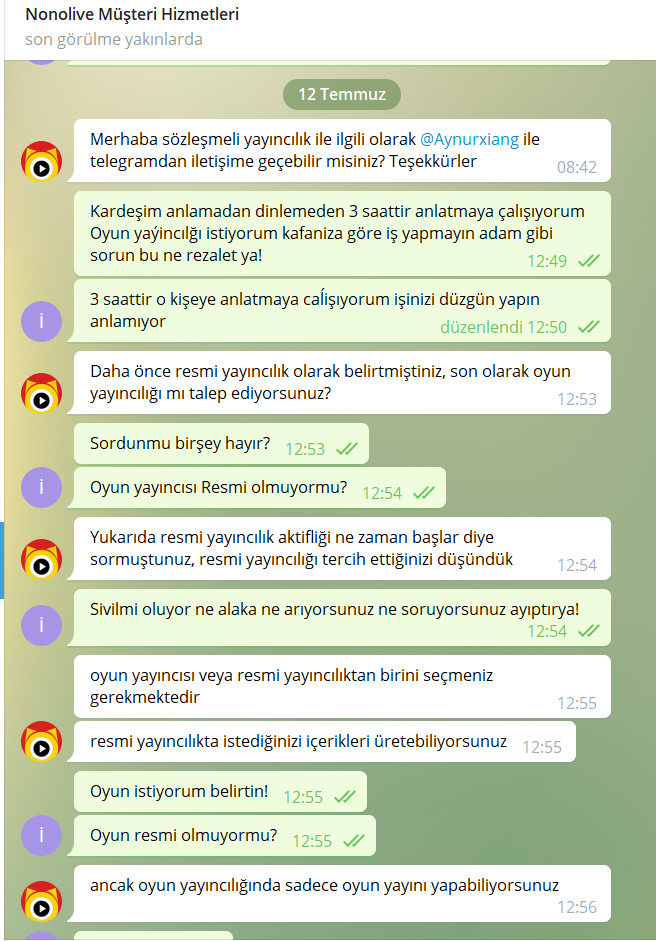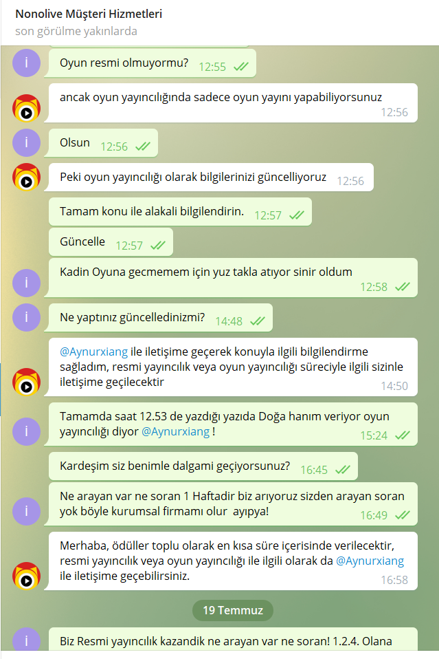 Telegram'dan Nonolive yetkilisi @Aynurxiang yapılan görüşme ve Telegram Nonolive Müşteri Hizmetleri ile yapaılan görüşme incelendiğmde birbirlerinden nekadar kopuk olduğunu görebilirsiniz.