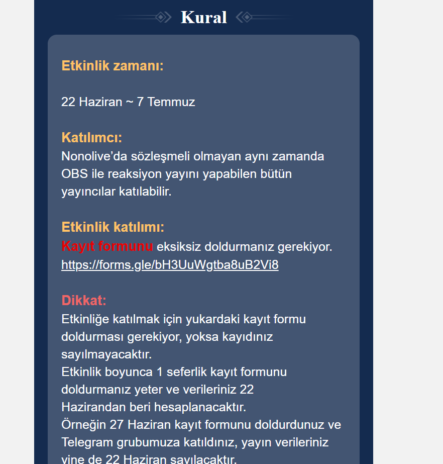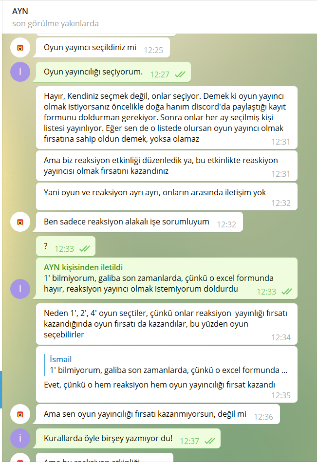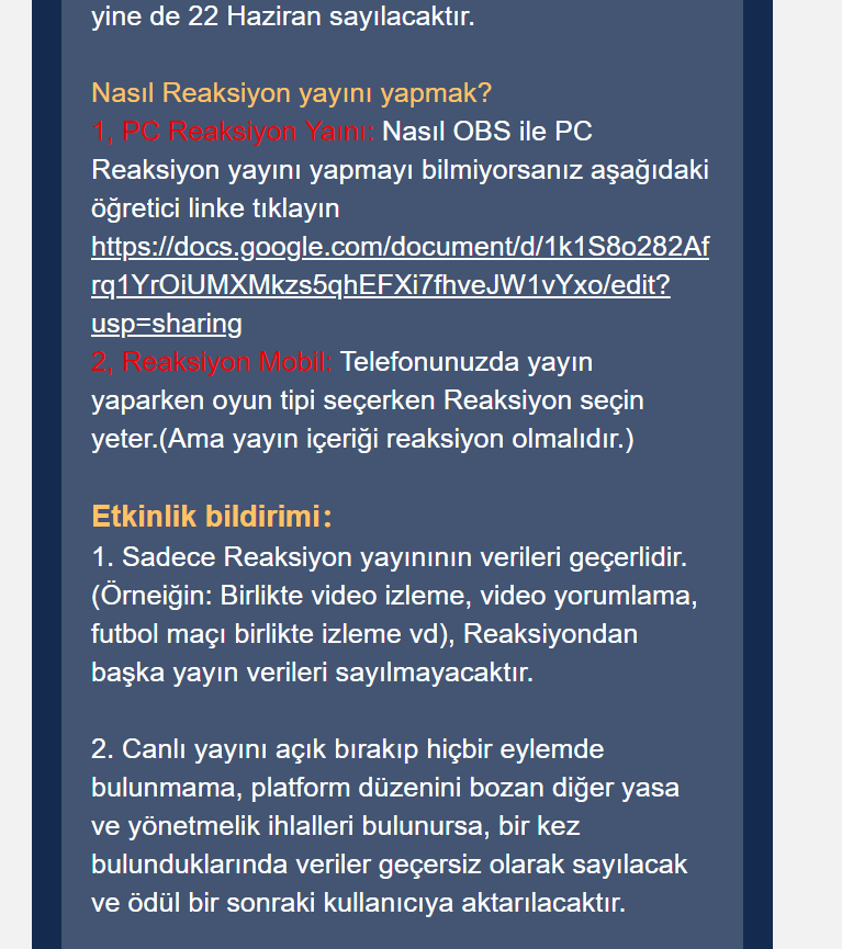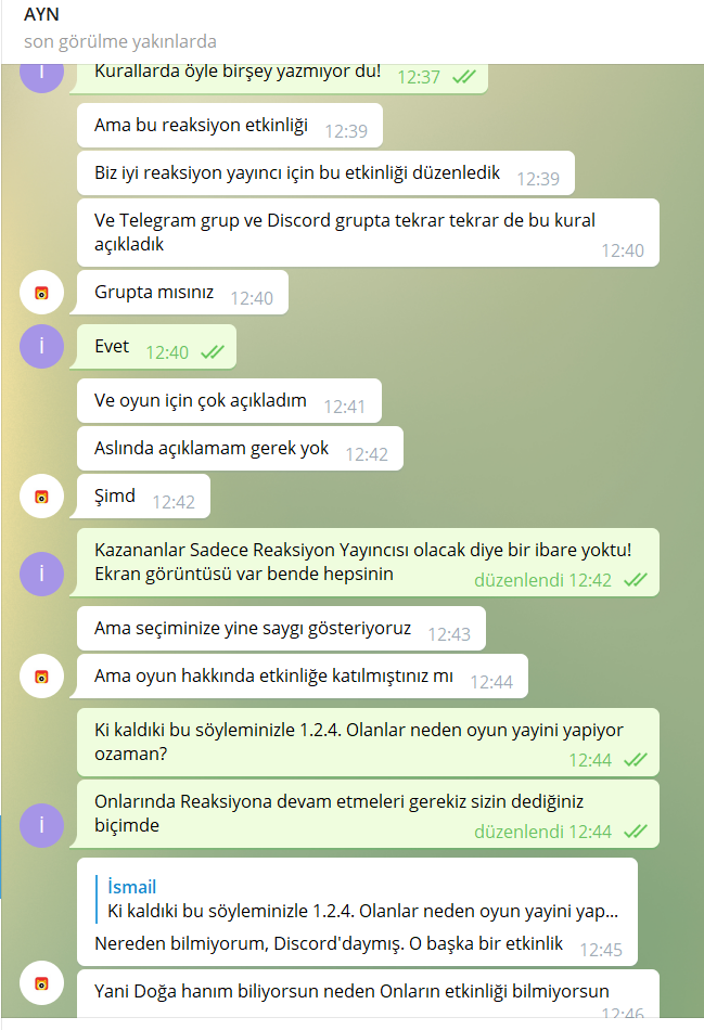 Haksızlık başlangıcı şu şekilde başlamaktadır Nonolive adlı yayın flatformu, 22 Haziran - 07 Temmuz tarihleri arasında Reaksiyon adlı bir etkinlik yarışma düzenlemiştir! bu etkinliğe enterhaber.com kamuensonhaber.com yayın yönetmenimizde katılmış etkinlikte 3.olmuştur! etkinlikte dereceye girenlere resmi yayıncılık verileceği yazılı olarak belirtilmiş bu yayıncılığın şu yayın bu yayıncılık adı vurgulanmamış etkinlikte isteyene istediği yayınclık verilmiş sadece enterhaber.com kamuensonhaber.com yayın yönetmenimize verilmemiştir! aşağıda delilleriyle sunacağımız şekilde ukalaca tavırlar takınıllmıştır. düşünsenize 1.2.4.5 ciye resmi Oyun yayıncılık veriliyor 3. es geçiliyor siz sadece sarı tikli yayıncı olacaksınız diye ukalalık yapılıyor konu hakkında enkısa zamanda hukiki işlemlere başlayacağız!