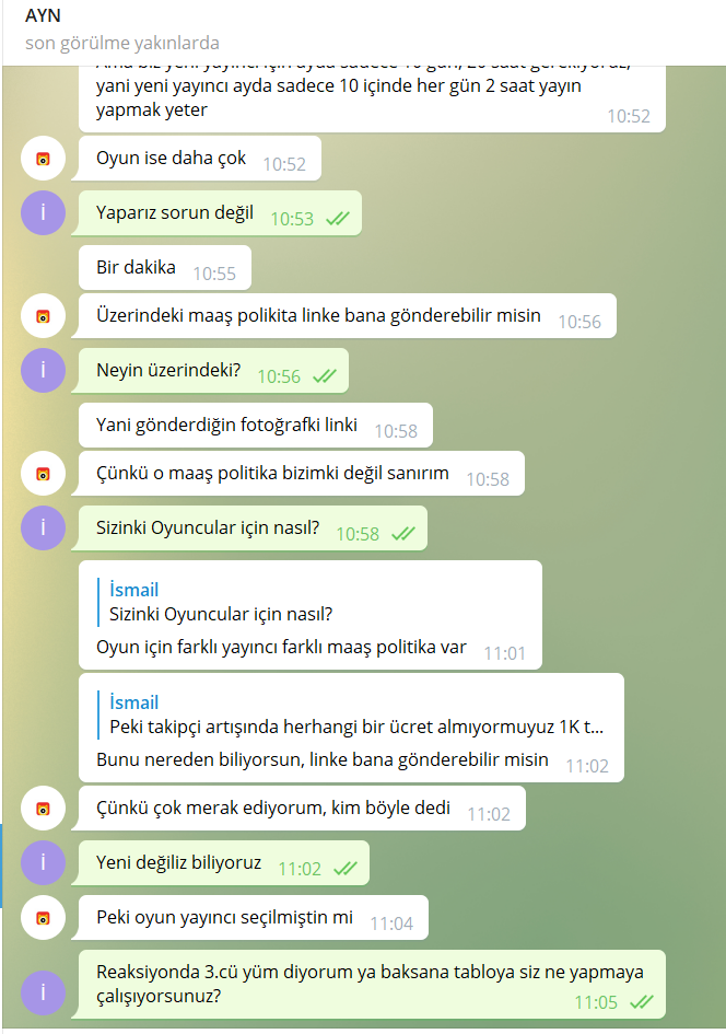 Haberimizde bazı oyun yayıncılarına 1K Takipçide yani her artışda 1K Baz alındığında 750 tl ücret ödendiğide açıklığa kavuşvuştur yetkili bunu açıkça itiraf etmiştir yazıları incelediğinizde göreceksiniz. tabi bunu her oyun yayıncısı bilmiyor gizli tutuyorlar Nonolive yetkilisi ile yaptığımız görüşmede bunu dile getirdiğimizde bize nerden bunu bildiğimizi soruyor açıkca böyle bir şeyin olduğunu itiraf etmiş oldu yazışmalarda bunu görebilirsiniz.