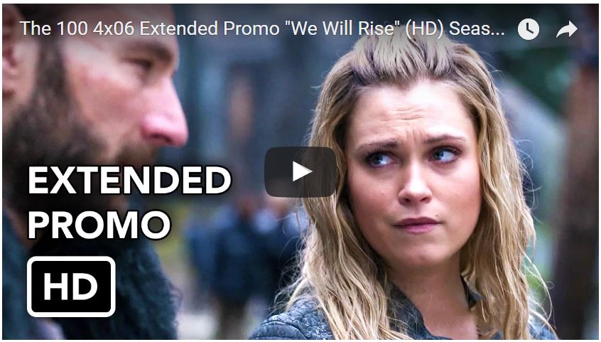 The 100 4x06 "We Will Rise" Season 4 Episode 6 Extended Promo - CLARKE AND ROAN WORK TOGETHER — Clarke (Eliza Taylor) and Roan (Zach McGowan) must work together in hostile territory in order to deliver an invaluable asset to Abby (Paige Turco) and her team. Bob Morley, Marie Avgeropoulos, Devon Bostick, Lindsey Morgan, Christopher Larkin, Richard Harmon, Isaiah Washington and Henry Ian Cusick also star. Dean White directed the episode written by Charmaine DeGrate (#406). Original airdate 3/15/2017.