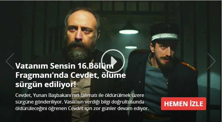 Vatanım Sensin 16 Şubat Perşembe 2017'de yayınlanacak 16. Bölümün yeni fragmanı yayında! Vasili, görevinden uzaklaştırılıyor, Cevdet sürgüne yollanıyor. Bu sürgünden dönüş olmayacağını Cevdet, ailesi, Tevfik ve Vasili biliyor. Tevfik, onun yokluğundan yararlanıp, Azize ile yarım kalan izdivacını tamamlayacağını, parmaklıklar ardındaki Cevdet'e ima edince, hiç beklemediği bir tepki ile karşı karşıya kalıyor. Öte yandan, Yunan Başbakan Yardımcısı, Türk Bayrağı olayını yapanların peşine düşüyor. Hilal ve arkadaşları için zorlu bir kaçış süreci başlıyor.